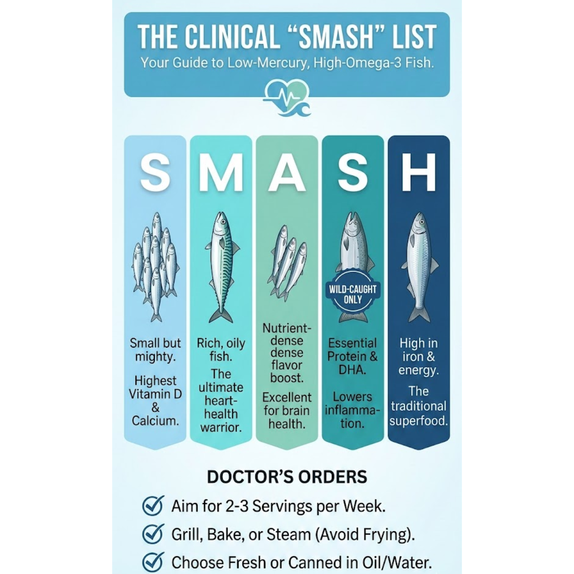 Best Way to PrepareWhat to AvoidGrill, Bake, or Steam: Preserves the fragile Omega-3 oils.Deep Fried: High heat and seed oils can negate the heart-health benefits.Canned in Water or Olive Oil: A convenient, high-protein pantry staple.High-Mercury Choices: Limit "trophy fish" like Shark or King Mackerel.Fresh Wild-Caught: The gold standard for a natural mineral profile.Breaded/Processed: Often contains unnecessary sodium and fillers.